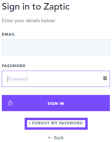Note: In situations where a dummy email is in use, please contact support@zaptic.com providing the email address associated with your account and informing them that you cannot reset using this method as the email is a dummy email.