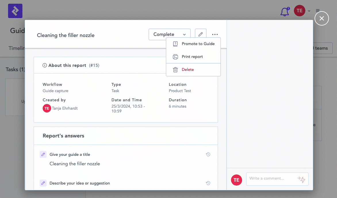 Create guides captured on the shop floor using simple tasks capturing text and media by converting their reports into guides at a click of a button. Capturing knowledge from the shop floor has never been easier!