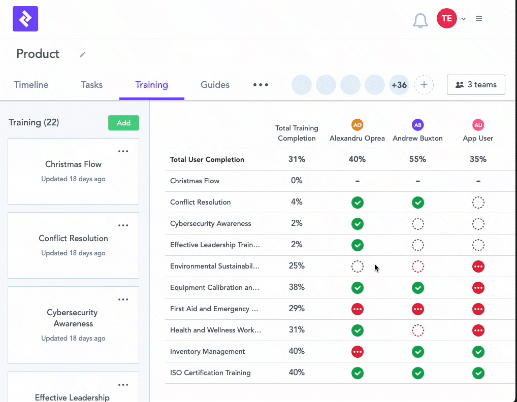 Training can be marked as completed from the training matrix, making it easier to get started with training and bringing in external certifications.This is great for keeping all shop floor training records in one place and ensuring people have the right certifications to carry out tasks.