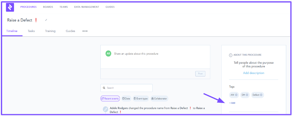 - Procedures can be tagged from within the procedure Timeline. By using the +Add and typing the Tag name (Zaptic will recommend previously added Tag names, for standardisation