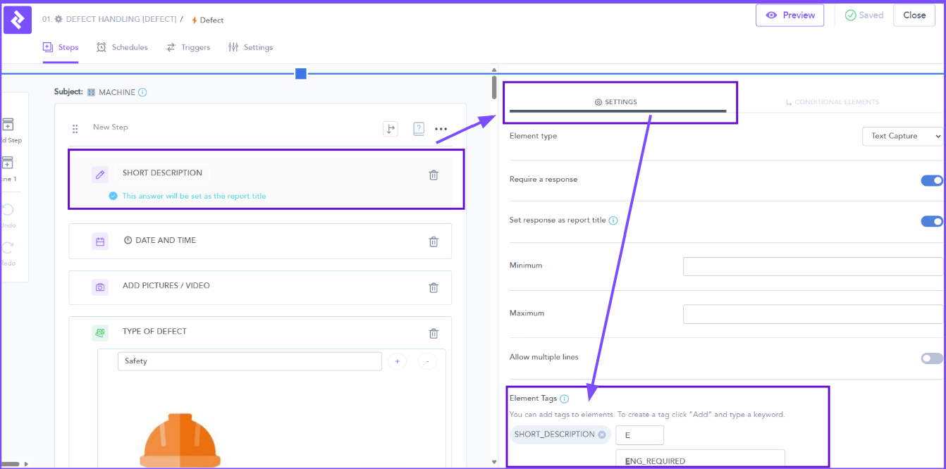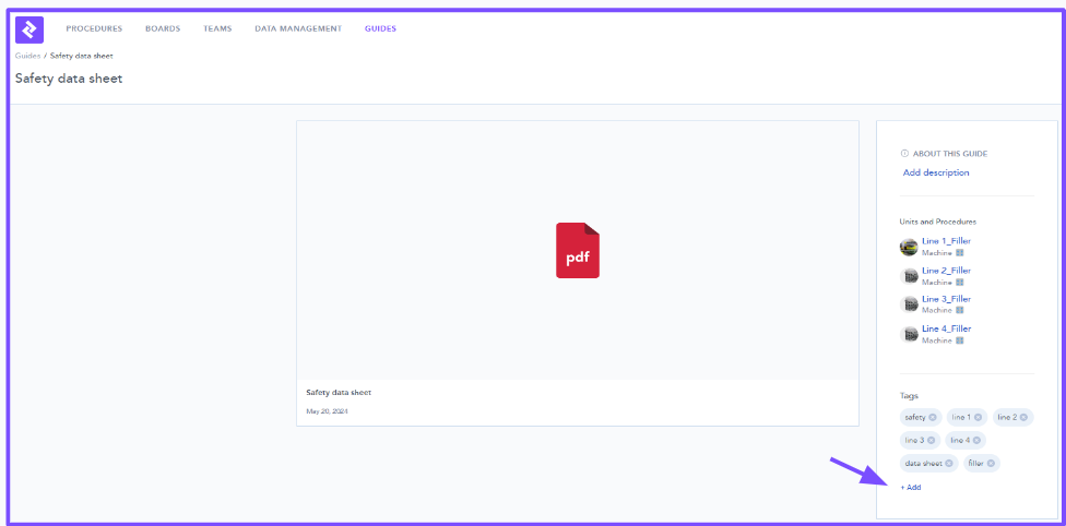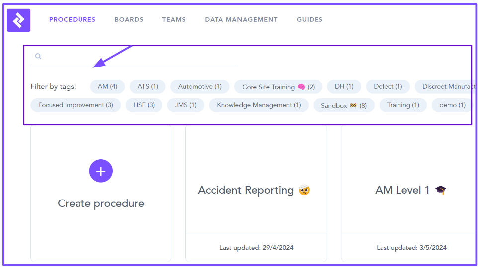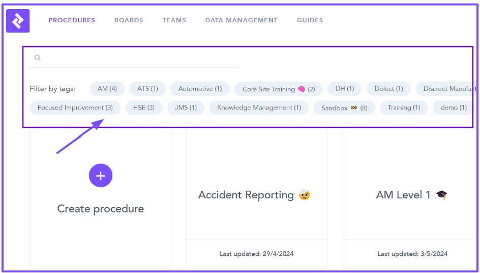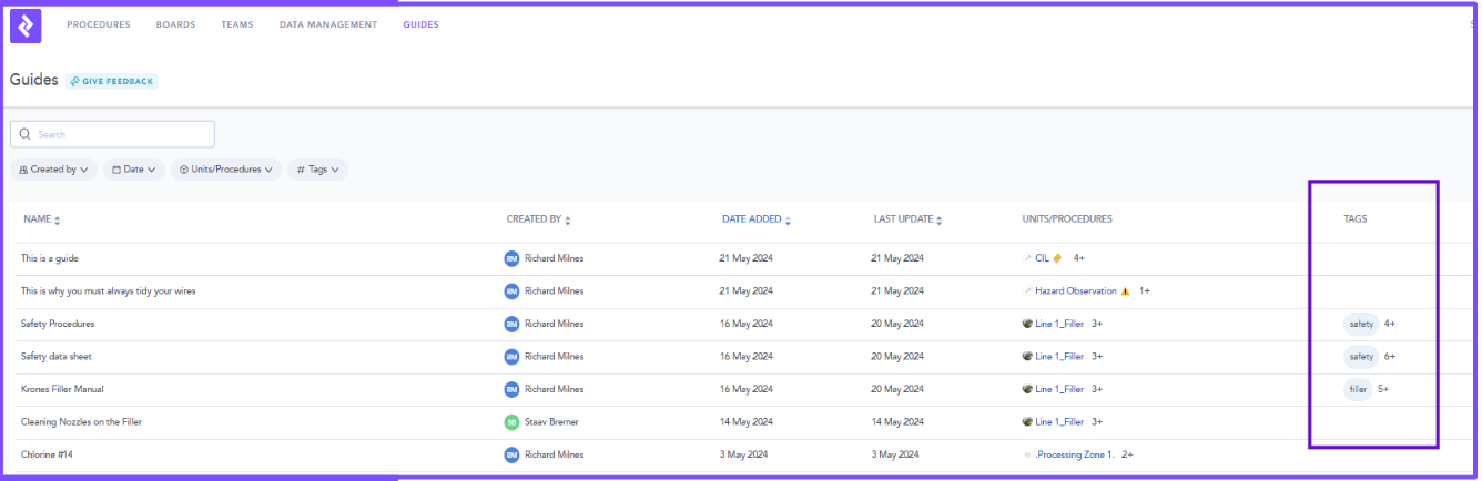 - When creating Procedures and Guides there is the opportunity to Tag the content. Content may have multiple Tags linked to the name, Machine, Line, user etc.