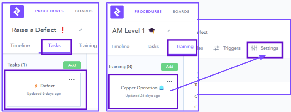 - Flows can be tagged from within the Task or Training. By selecting Settings then typing the Tag name (Zaptic will recommend previously added Tag names, for standardisation)