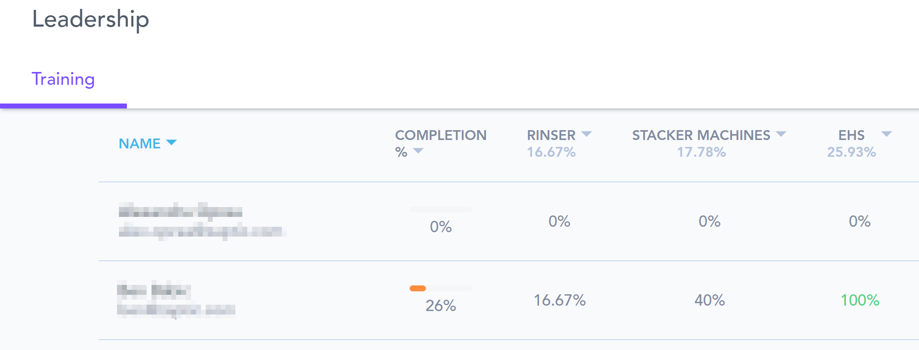 Clicking on a team allows you to see the training compliance of each individual user within that team. Below is my "Leadership" team: