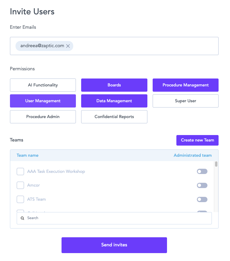 - To invite users to Zaptic, as well as teams, enter their email address(es) into the "Enter emails" box. Press space or comma after entering an email address to enter another.