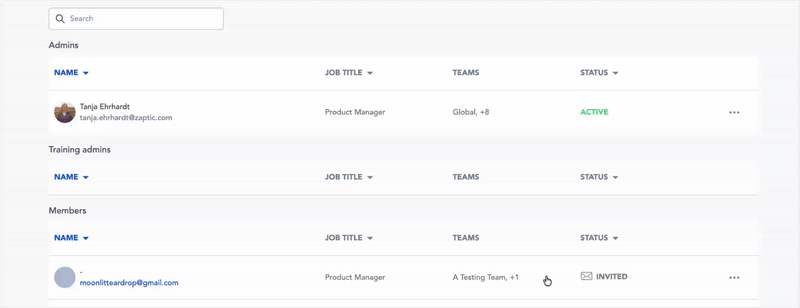 This page contains all the users invited to your Zaptic instance. It also provides information such as: