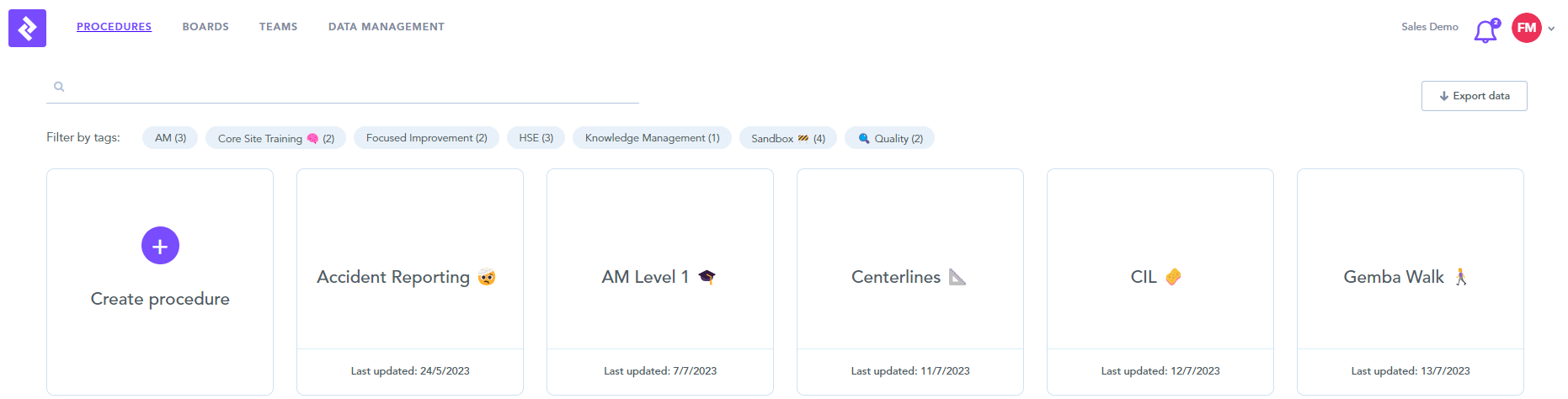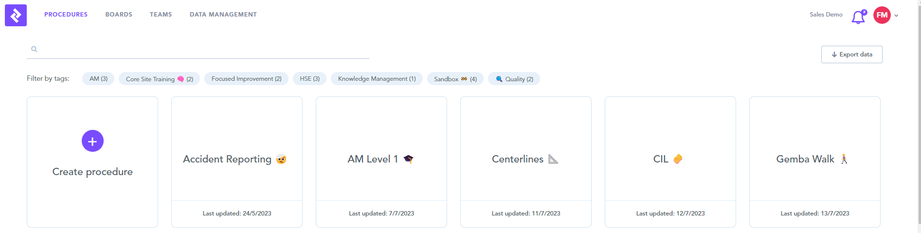 - When you log into your Procedures page, in the top right corner you will see ‘Export data’
