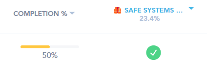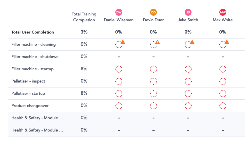 - The % shows the total training completion comparing the total number of modules against the completed modules. This can also be viewed in more detail on the user’s account page by clicking the user name.