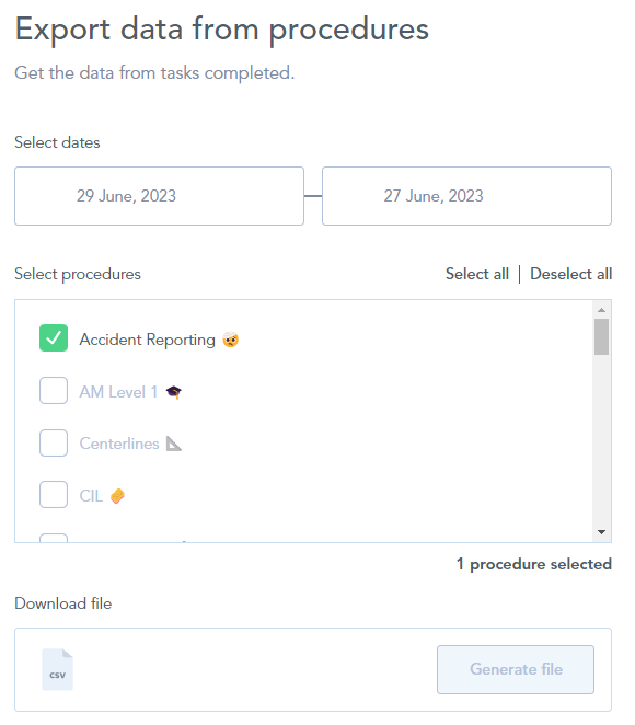 - Here you can select a date range, which procedure you would like to see the data for, and you can then download this as a spreadsheet file.