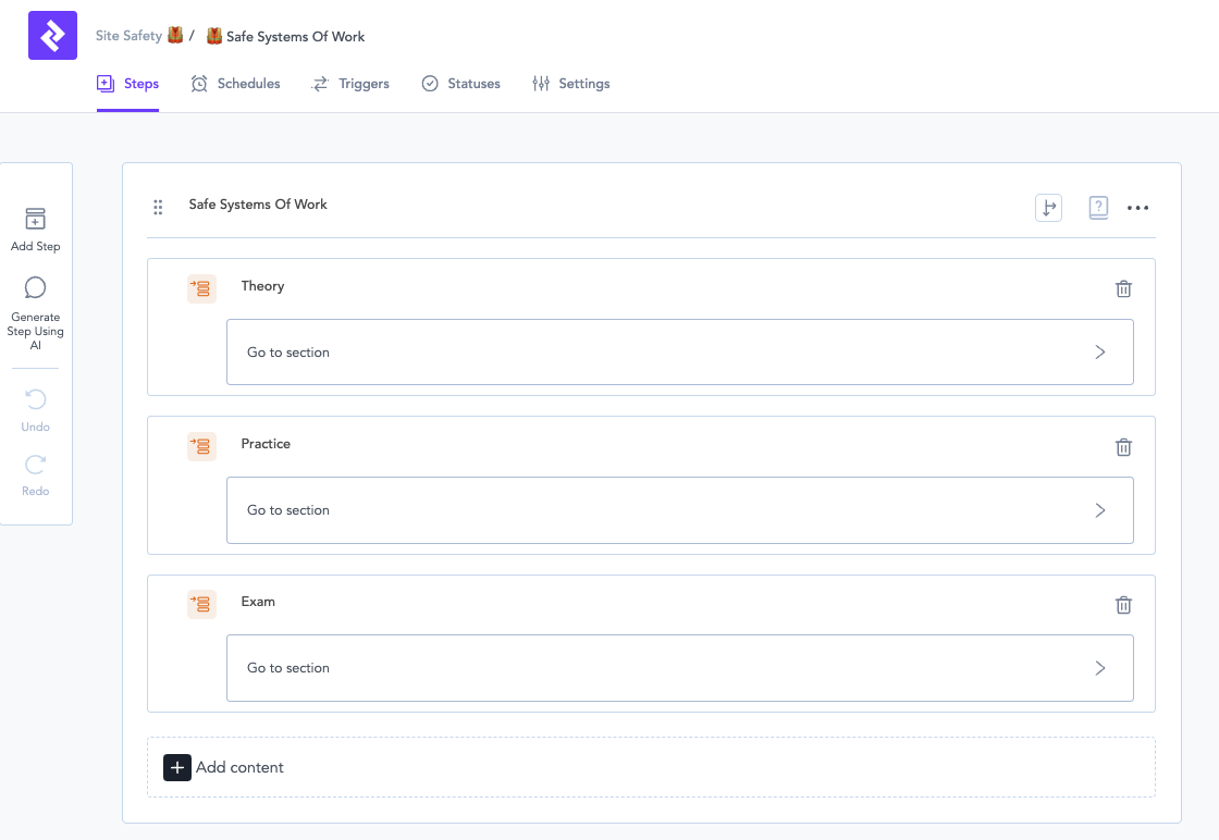 - You can use Sections to break the Training into different areas, such as “Theory”, “Practice” and then finally “Exam”.