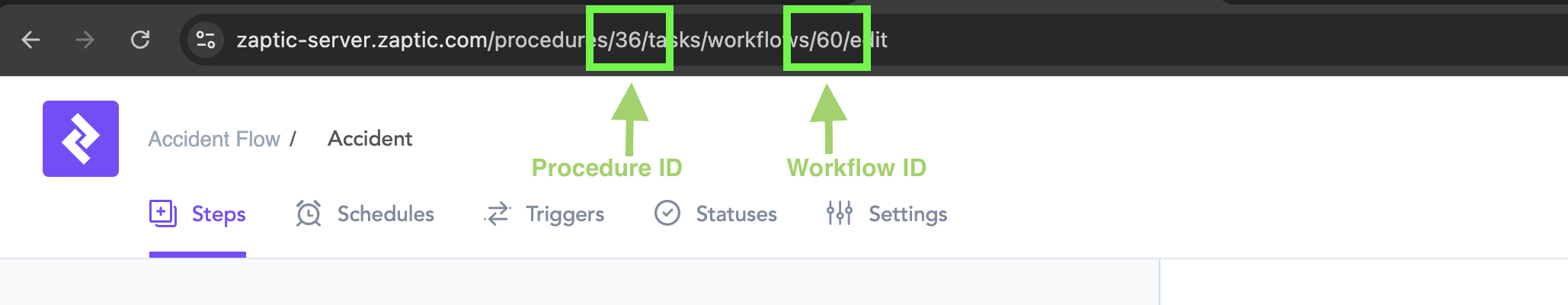 The specific Procedure ID and Workflow ID can be found at the end of the webpage's URL when opening the workflow on the Portal via a web browser. The first number found will be the Procedure ID, and the second number will be the Workflow ID.