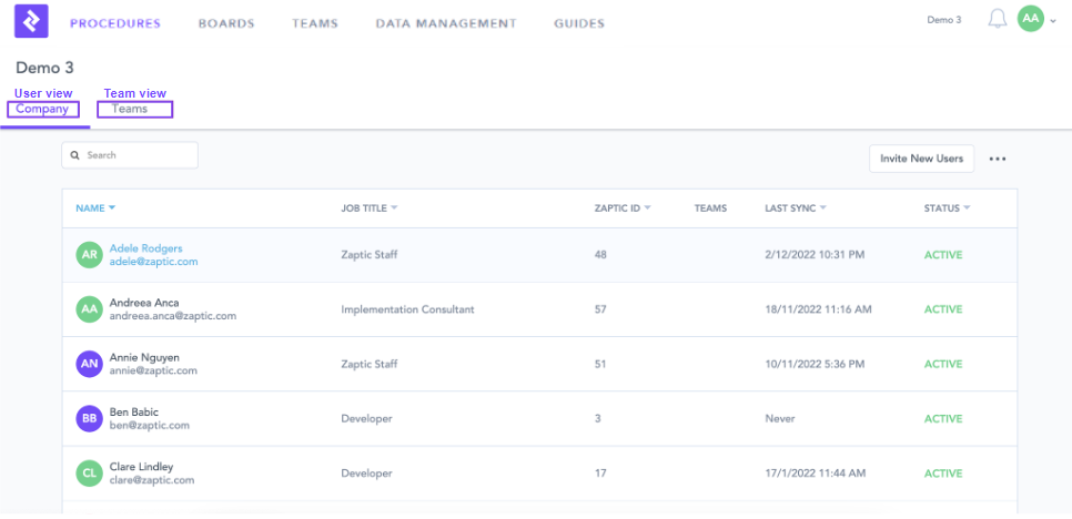 The place to view and manage users and teams in Zaptic.